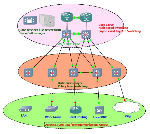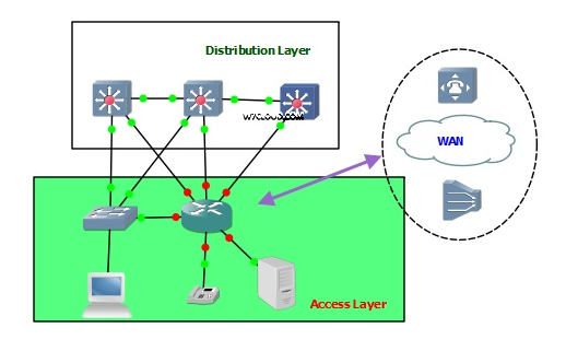 Access layer is the lower layer of Cisco 3-layer model running different networks services and also responsible for providing access to different network resources. This is our local and remote workgroup-access that is providing access to different services like workgroups, WAN connectivity. Normally here we are running with low end devices like 2900 series switches. Access layer includes shared LAN, switched LAN and VLAN to workstations and servers, provide access to PSTN, WAN, DSL etc.